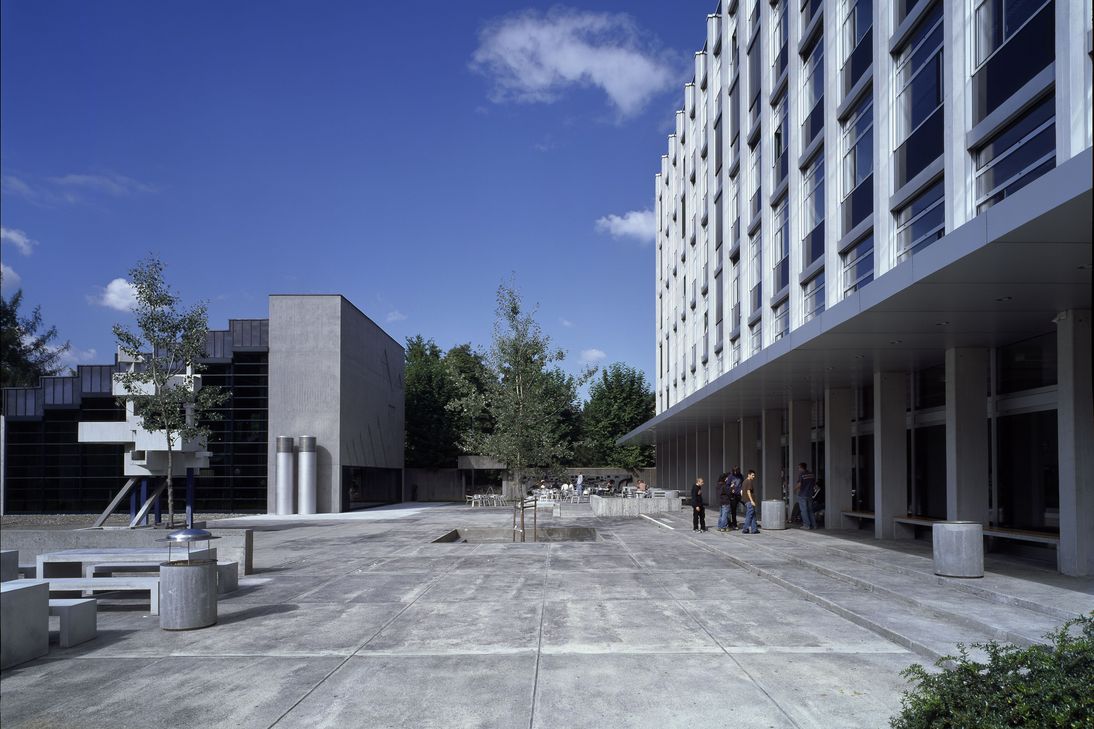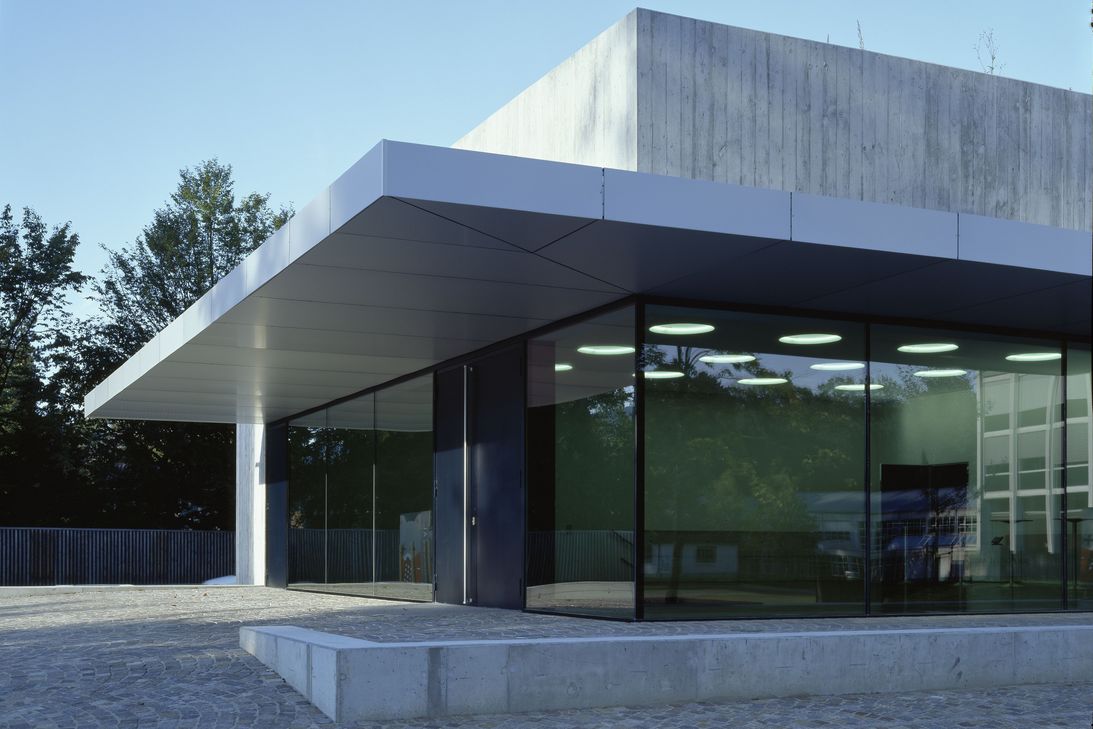 Im Westen wurde das neue Foyer angegliedert. Es übernimmt die Höhe der ehemaligen Abwartwohnung und öffnet sich mit einer vordachgeschützten Glasfront gegen Süden und Westen, wo sich der neue Eingang befindet.