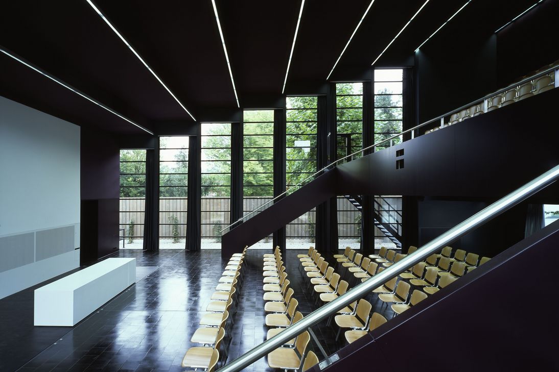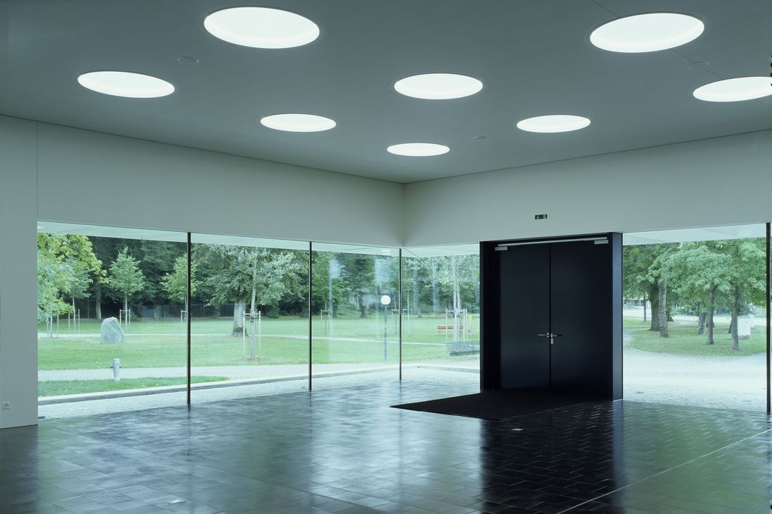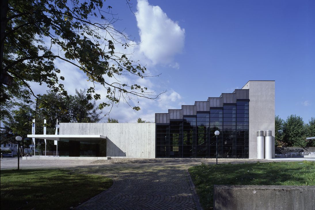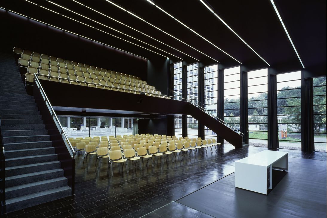 Das Foyer ist als einfacher, liegender Kubus aus Sichtbeton gestaltet und bildet so das Gegenstück zum hohen Sichtbetonvolumen, welches das Gebäude im Osten abschliesst. Mit grossen Oblichtern wird das Foyer mit Tageslicht ausgeleuchtet. WC-Anlagen, Möbellager und Technik finden in den vorhandenen Untergeschossräumen Platz. Foyer und Saal sind mit modernster audiovisueller Technik ausgestattet.