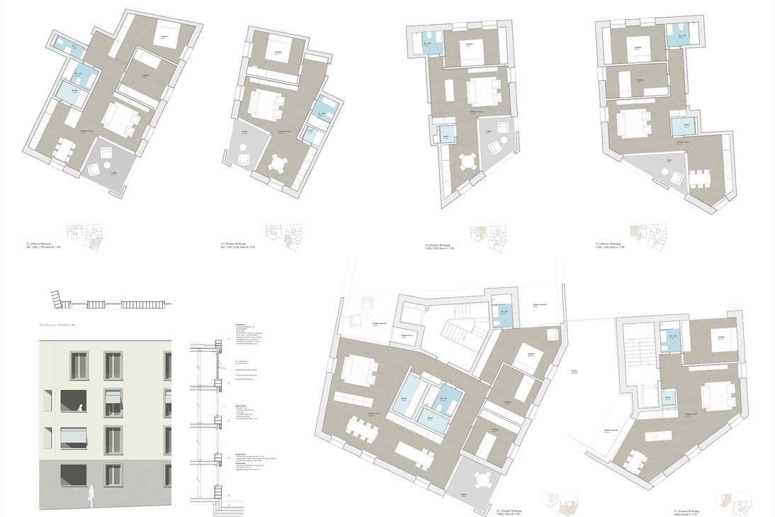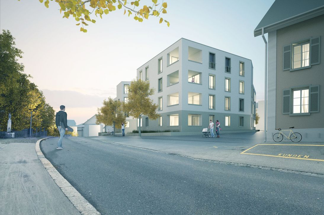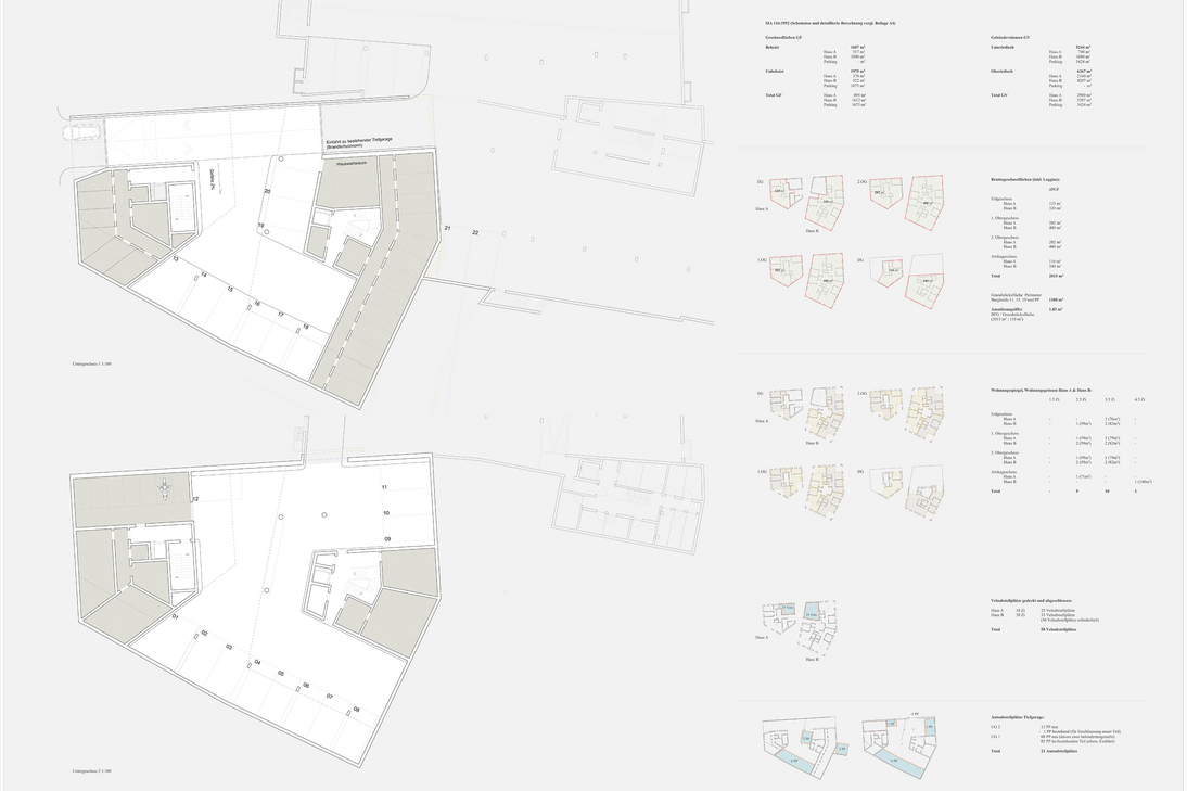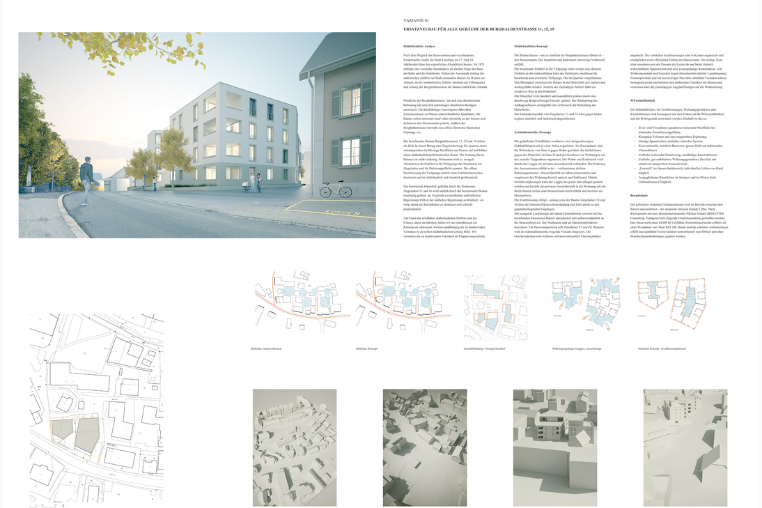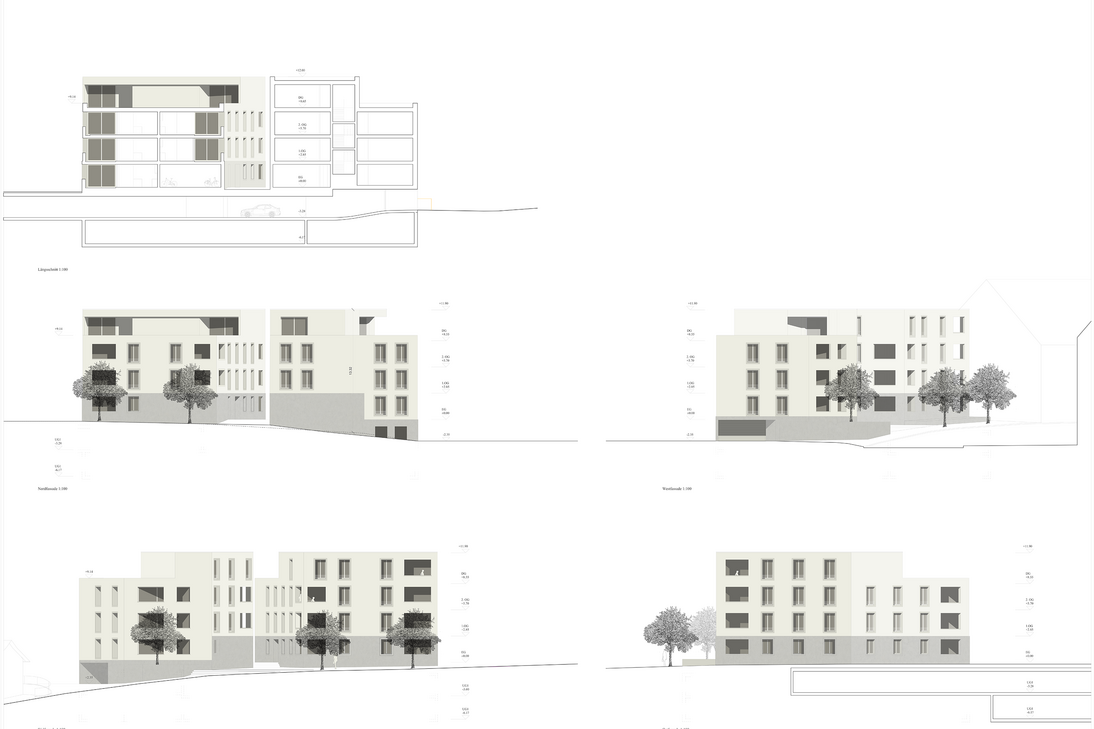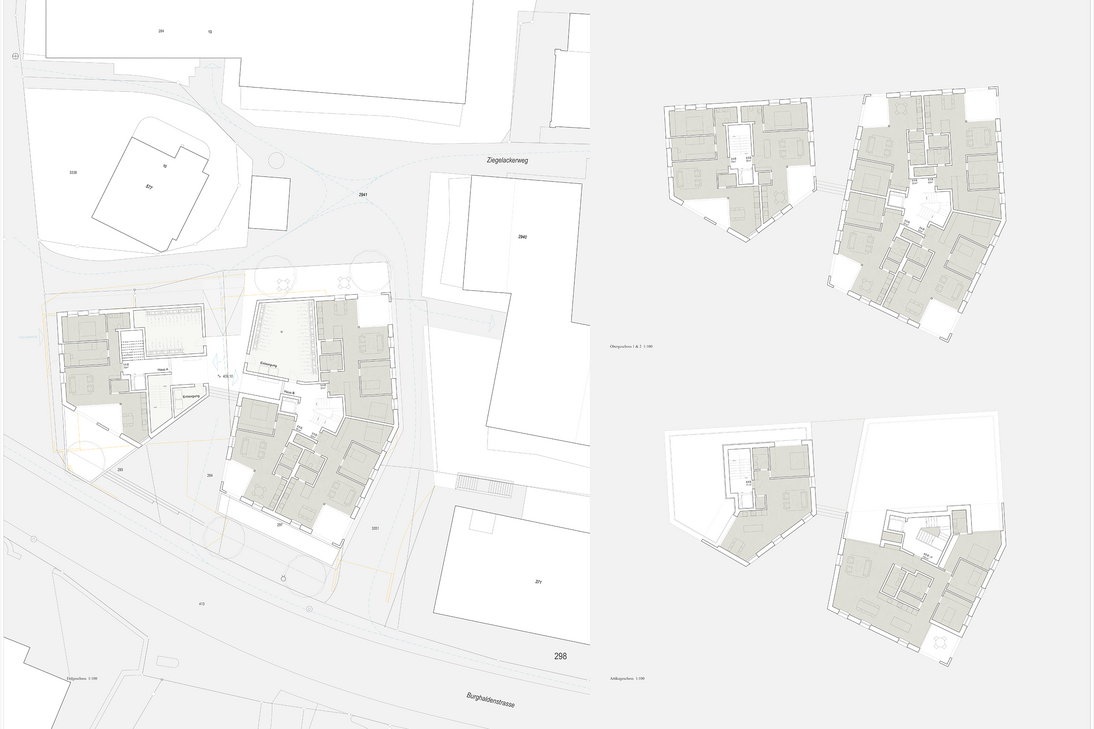 Die Bauten fassen – wie es nördlich der Burghaldenstrasse üblich ist – den Strassenraum. Der räumliche und funktional schwierige Vorbereich entfällt. Die bestehende Einfahrt in die Tiefgarage wird verlegt; eine diskrete Einfahrt an der südwestlichen Ecke des Perimeters erschliesst die bestehende und erweiterte Tiefgarage. Die im Quartier vorgefundene Durchlässigkeit zwischen den Bauten in die Hinterhöfe soll ergänzt und weitergeführt werden. Anstelle der ehemaligen Abfahrt führt ein attraktiver Weg in den Hinterhof. Der Hinterhof wird räumlich und masstäblich präzise durch eine durchwegs dreigeschossige Fassade gefasst. Der Rücksprung des Attikageschosses ermöglicht eine verbesserte die Belichtung des Hinterhofes. Das Gebäudeensemble von Ziegelacker 13 und 16 wird gegen Süden ergänzt, räumlich und funktional abgeschlossen. Architektonisches Konzept Die geforderten Nutzflächen werden in zwei dreigeschossigen Gebäudekörpern mit je einer Attika organisiert. Als Zweispänner sind die Wohnräume von Haus A gegen Süden gerichtet, die Schlafräume gegen den Hinterhof. In Haus B sind pro Geschoss vier Wohnungen um das zentrale Treppenhaus organisiert. Der Wohn- und Essbereich wird durch eine Loggia als privaten Aussenbereich verbunden. Der Einbezug des Aussenraumes erhöht in der - vorhandenen, dichten Bebauungsstruktur - dessen Qualität als Jahreszeitenzimmer und vergrössert den Wohnungsbereich optisch und funktional. Mittels Schiebeverglasungen kann die Loggia das ganze Jahr adäquat genutzt werden und bezieht den privaten Aussenbereich in die Wohnung mit ein. Beide Bauten stehen zum Strassenraum leicht erhöht und besitzen ein Hochparterre. Die Erschliessung erfolgt – analog jener der Bauten Ziegelacker 13 und 16 über die Hinterhoffläche rollstuhlgängig und führt direkt zu den gegenüberliegenden Eingängen. Die kompakte Lochfassade mit einem Fensterformat verweist auf die bestehenden klassischen Bauten und gliedert sich selbstverständlich in die Strassenfront ein. Die Neubauten sind als Massivkonstruktion konzipiert. Ein Massivmauerwerk (zB. Porotherm T7 von ZZ Wancor) wird als wärmedämmende, tragende Fassade eingesetzt. Die Geschossdecken sind in Beton, mit konventionellen Unterlagsböden angedacht. Die vertikalen Erschliessungen sind in Kernen organisiert und ermöglichen einen effizienten Einbau der Haustechnik. Der mittige Kern trägt zusammen mit der Fassade die Lasten ab und bietet dadurch wirtschaftliche Spannweiten und eine kostengünstige Konstruktion. Alle Wohnungswände und Fassaden liegen übereinander (direkte Lastabtragung). Fenstergewände und ein hochwertiger Putz über sämtliche Fassaden wirken homogenisierend und betonen den städtischen Charakter der Bauten und verweisen über die grosszügigen Loggiaöffnungen auf die Wohnnutzung.