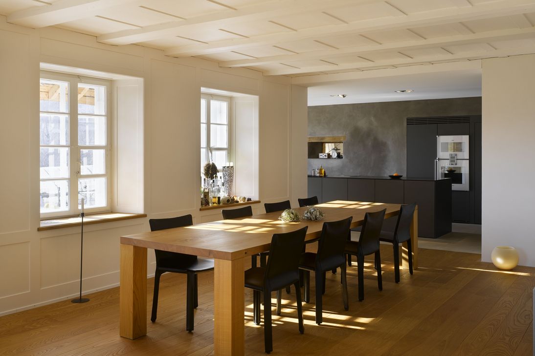 Das alte Bauernhaus mit Ökonomieteil wurde in ein Wohnhaus für eine vierköpfige Familie umgebaut. Die Bauherrschaft wollte den Charakter im bestehenden Wohnteil erhalten. Sie wünschte sich neuzeitliche Grosszügigkeit und Komfort insbesondere für Nasszellen und die Küche und ein Interieur mit einer warmen Ausstrahlung in Natur belassenen Materialien. Ein starker Bezug zum Aussenbereich und grosszügiges Tageslicht waren wichtig, ebenso eine gute Energiebilanz. Von Seiten der Gemeinde waren die Eingliederung in die umliegenden Bauten im Sinne des Ortsbildschutzes und der Erhalt des Bauernhauscharakters vorgegeben. Für den Innenbereich bestanden keine Vorgaben.