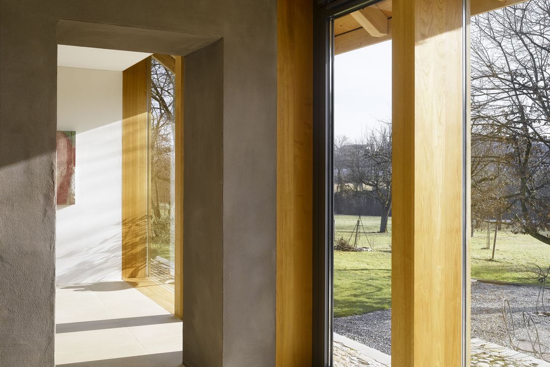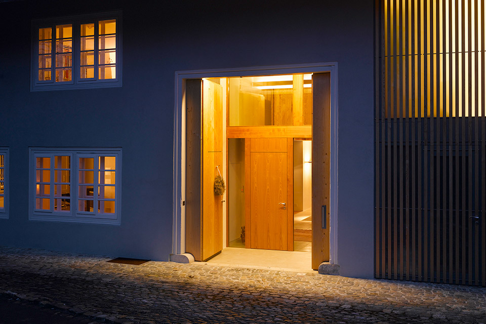 Der Haupteingang erfolgt neu durch das rekonstruierte Tenntor und einen Windfang, der durch eine zweite, zweigeschossige Innenverglasung begrenzt wird. Im anschliessenden Entrée befindet sich der Treppenaufgang in den ersten Stock. Der Übergang zur offenen Küche und dem Wohnbereich rund um den grossen Holzofen ist fliessend. Daneben führt ein Zweitzugang direkt in einen unbeheizten Raum, der als Werkstatt, Brennholzlager und Vorratsraum dient.