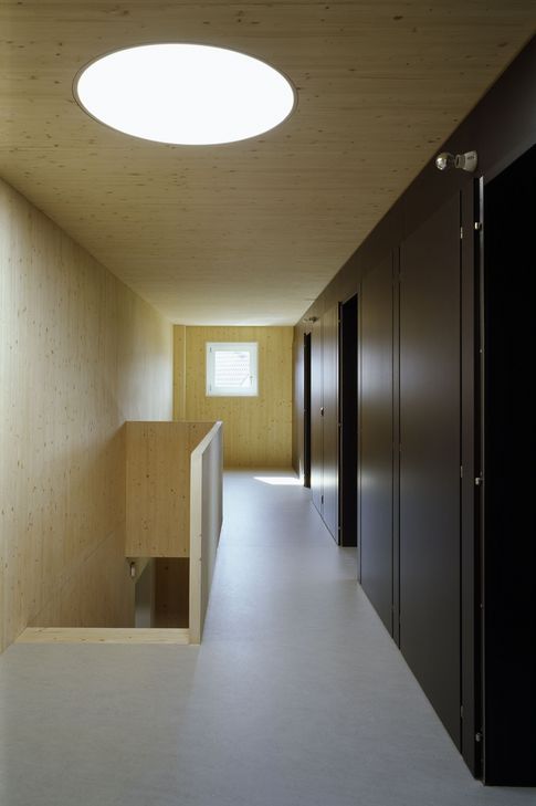 Im Obergeschoss sind drei mittlere und ein grosses Schlafzimmer sowie ein zweites Bad angeordnet. Das Korridorende kann als Spiel- und Arbeitsnische genutzt werden. Korridor und Bad im Obergeschoss sind mit Oblichtern belichtet und bieten viel Privatsphäre. Die markante Schrankzone trennt Korridor und Zimmerzone. Sie birgt im Blendenbereich zur Decke sämtliche haustechnischen Installationen. Diese sind über die demontablen Blendenelemente jederzeit kontrollierbar und können leicht an sich ändernde Bedürfnisse angepasst werden.