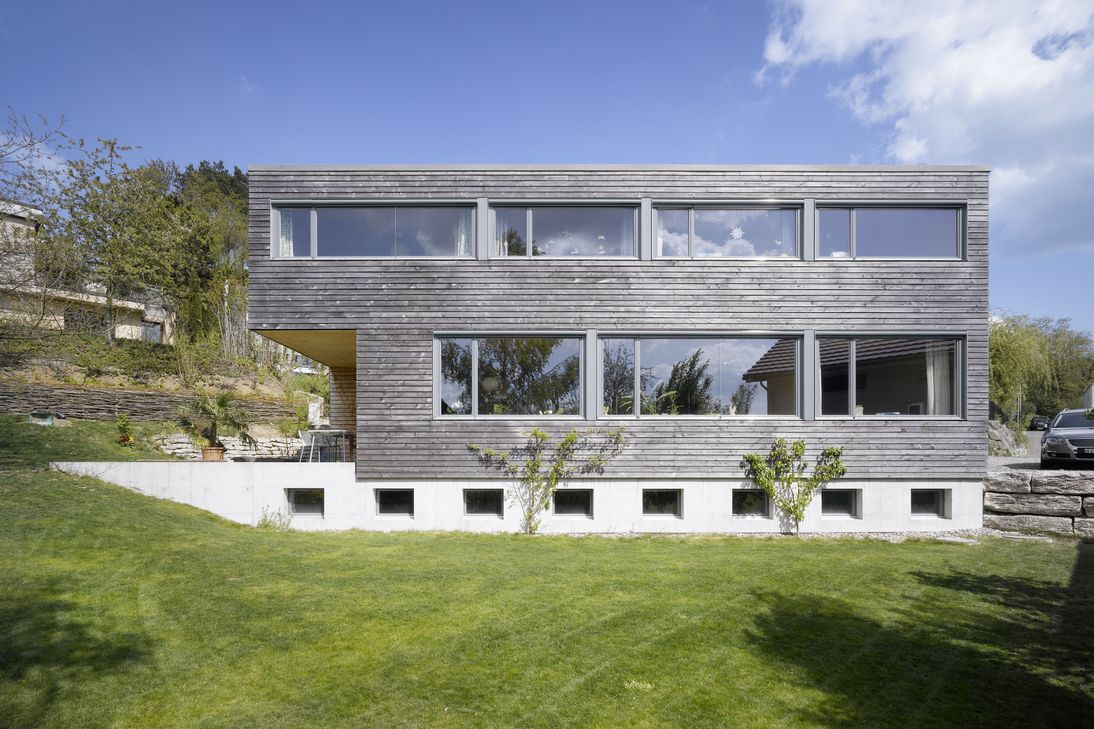 Die besondere Ausprägung dieses WELLWOOD Hauses liegt im auskragenden Obergeschoss, welches den gedeckten Aussensitzplatz formt. Durch den Bau in Holzelementbauweise lassen sich Auskragungen in einfacher Art und Weise realisieren, ohne Abstriche in der Wärmedämmung der Gebäudehülle in Kauf nehmen zu müssen.