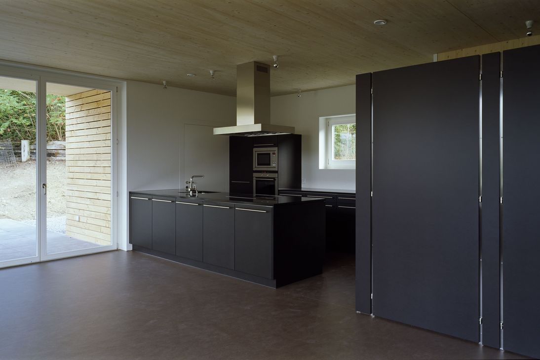 Die Materialisierung des Hauses lässt sich mit dem Begriff Edelrohbau beschreiben. Wände und Decken sind als roh belassene Holzelemente in Fichte/Tanne-Mehrschichtplatten eingesetzt. Sie lassen sich auch zu einem späteren Zeitpunkt weiter veredeln, sei es durch das Aufbringen einer Holzlasur oder durch das Belegen mit einer Gipskartonplatte. Die Böden sind mit Linoleum ausgelegt, Schrankfronten und Küche aus schwarz eingefärbtem MDF hergestellt.