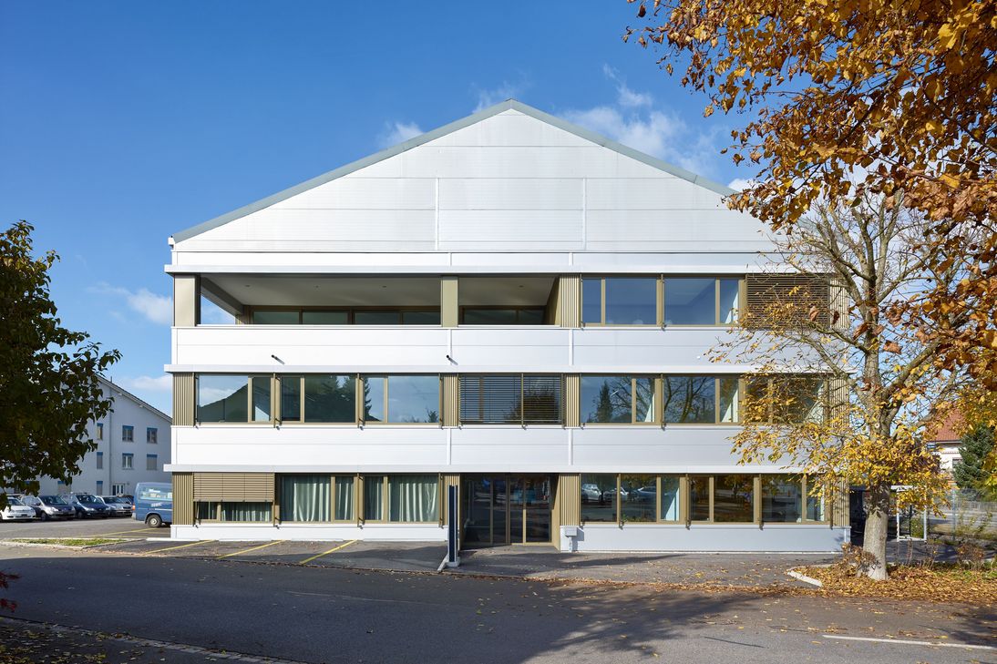 Das Umbaukonzept von FWS Architekten setzt diese Ziele konsequent um. Den Bedürfnissen des arbeitenden Menschen werden wir gerecht, indem die Anlage vom Zugang bis zum einzelnen Arbeitsplatz übersichtlich und grosszügig gestaltet ist. Der kleine „Luxus“ in diesem Objekt ist der breite Erschliessungsgang in der Gebäudemitte mit den inneren Fenstern , welche dem Vorbeigehenden einen Blick zu den Arbeitsplätzen seiner Kolleginnen und Kollegen ermöglicht. Alle Arbeitsplätze verfügen über eine ausreichende Versorgung mit Tageslicht und gewähren einen Ausblick in die Landschaft. Die prominente Lage des Essraumes im 2. Obergeschoss mit seiner Terrasse gegen Süden drückt den Wert der sozialen Integration aus. Die Gebäudestruktur der bestehenden Halle wird wie vorhanden weiterinterpretiert. Die primäre statische Struktur wird ergänzt durch zwei Stützenreihen in der Mitte der Halle, welche den innenliegenden Korridor von den Nutzräumen trennen. Die Effizienz der Betriebsabläufe gründet in den kurzen Wegen von der Anlieferung zum Lager bzw. zum Warenlift und auf den Geschossen zu den Produktionseinrichtungen. Über Haupt- und Nebeneingänge gelangen die Mitarbeiter von den Parkplätzen zu den beiden Treppenhäusern, von da zu den Garderoben, welche unmittelbar daneben liegen und über den inneren Erschliessungsgang zu den Produktionsstätten und Gemeinschafträumen.