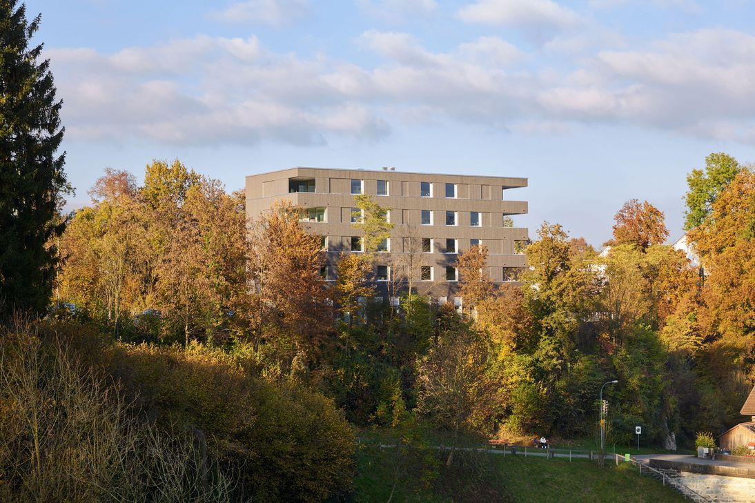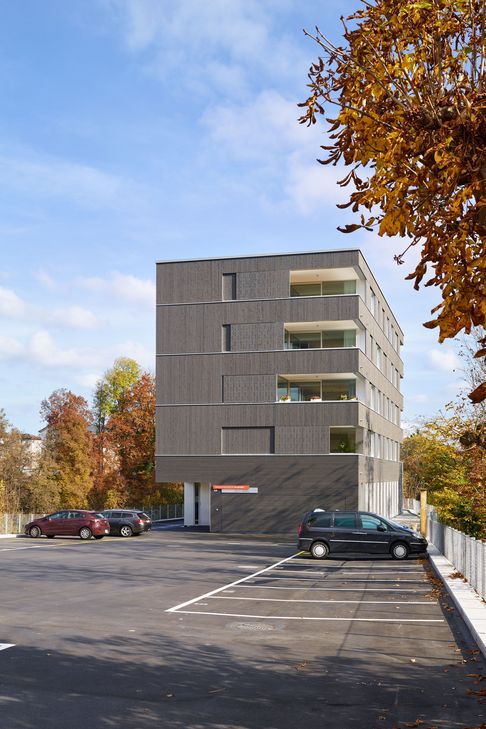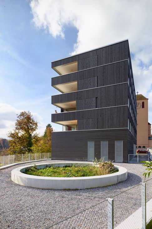 Damit das respektable Volumen die Kirche nicht konkurriert, wurde für die Fassade in Zusammenarbeit mit dem Heimatschutz ein dunkler Farbton gewählt, welcher auf die umliegenden Dächer abgestimmt ist und das Gebäude volumetrisch kleiner erscheinen lässt. Die Obergeschosse sind mit einer flächenbündigen Vertikalschalung verkleidet, der Sockel ist mit einer horizontalen Schalung mit Schattenfugen fein differenziert.
