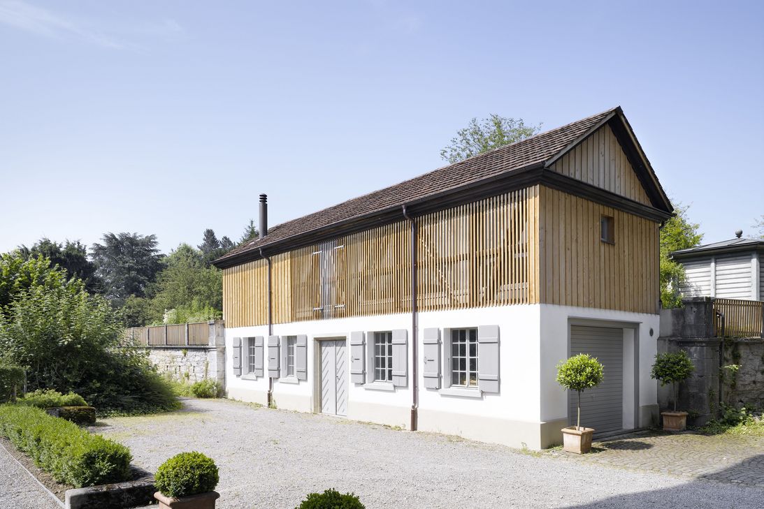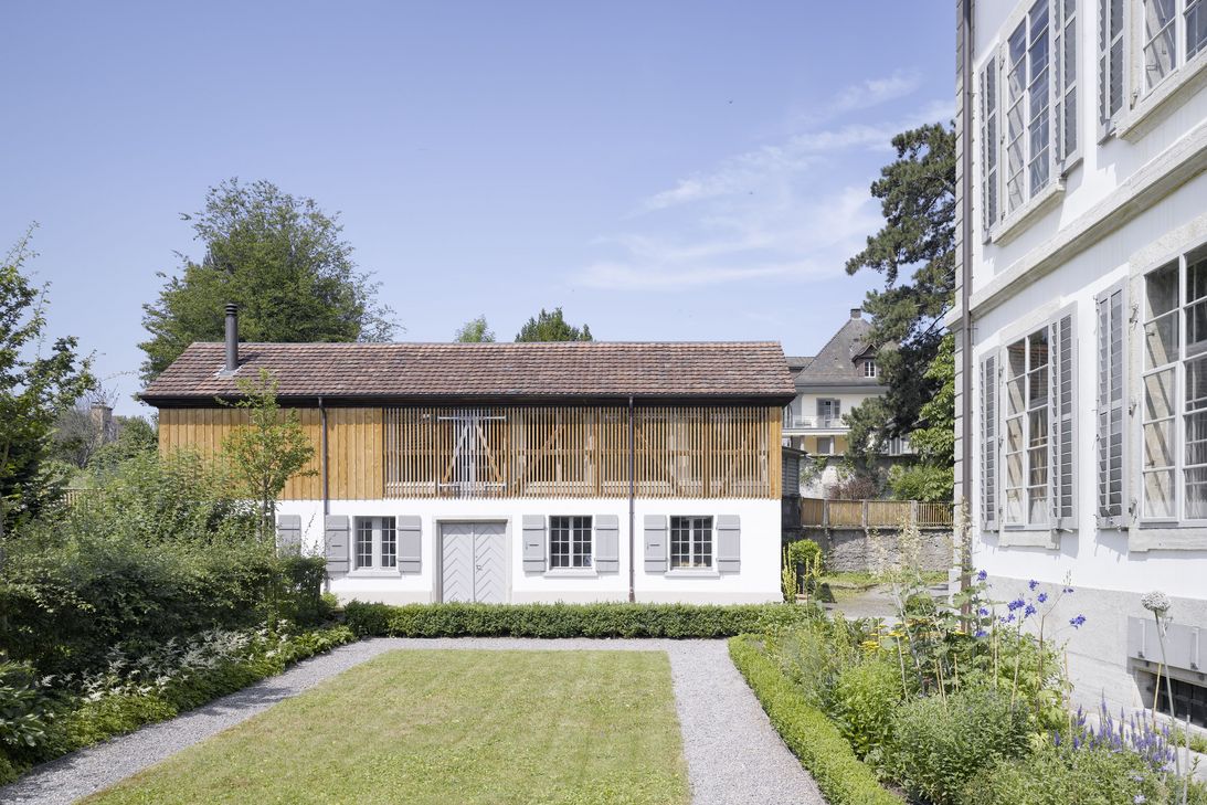 Am Eingangshof, angelehnt an die Stützmauer aus dem 18. Jahrhundert, wurde vor etwa 100 Jahren ein Nebengebäude errichtet. Im gemauerten Erdgeschoss befanden sich Garage und Waschküche, das Obergeschoss in Holz diente zum Wäschetrocknen und als Brennholzspeicher. Dieses so genannte Gartenhaus wurde renoviert und teilweise umgenutzt. Im Obergeschoss wurde eine Zweizimmerwohnung für Gastschriftsteller eingerichtet. Sie öffnet sich nach Südwesten zum oberen Garten. Gegen Osten wurde der durchlässige Lattenverschlag beibehalten und die Fensterfront dahinter angeordnet. So hat sich das Äussere mit der Umnutzung nur unmerklich verändert.