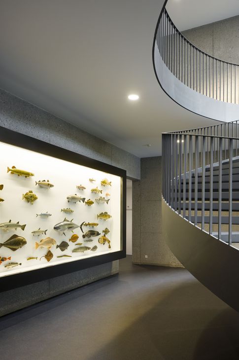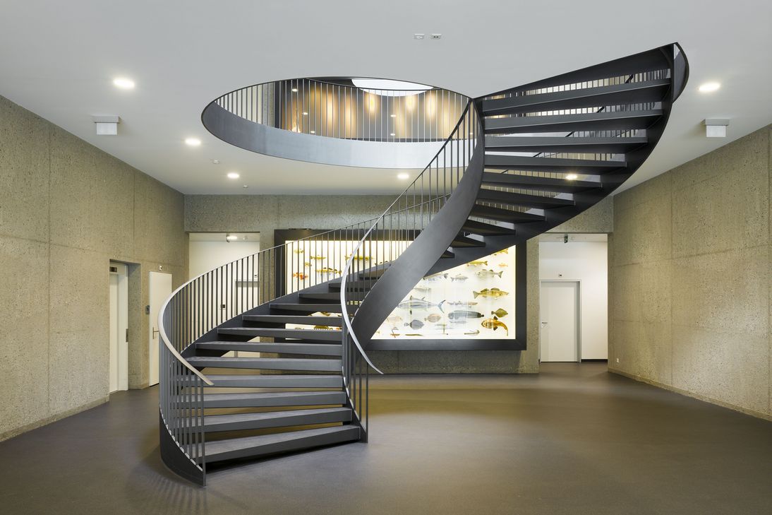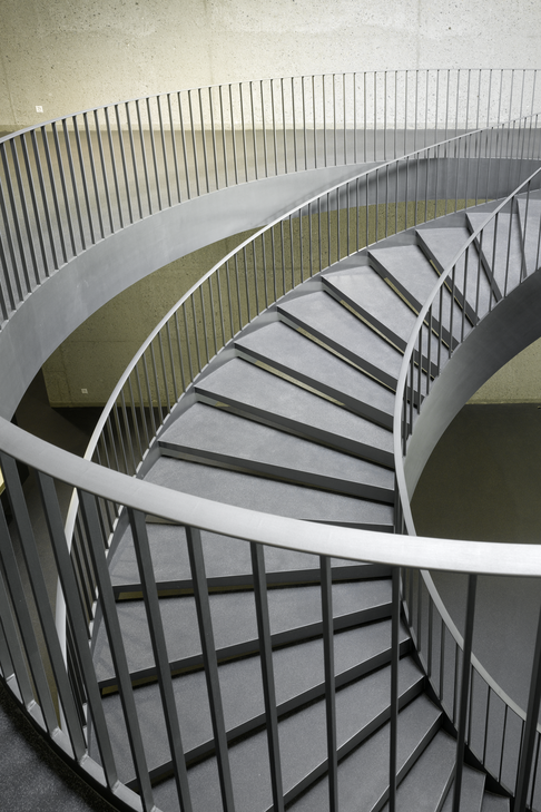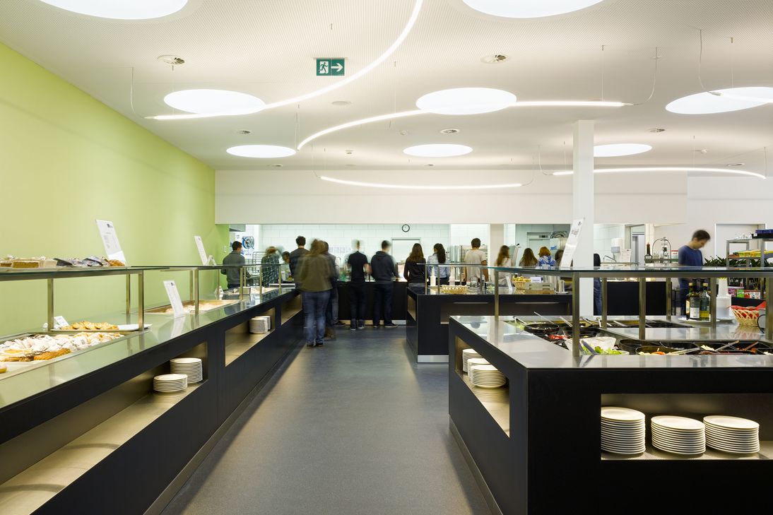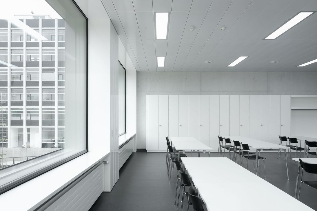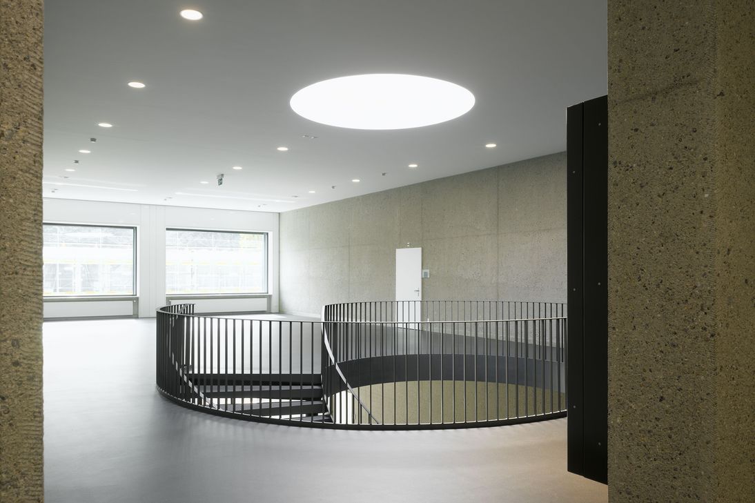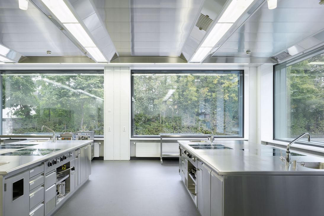 Im Erdgeschoss des Neubaus sind die Köche, im Obergeschoss die Bäcker-Konditoren-Confiseure untergebracht. Die Schul- und Vorbereitungszimmer ordnen sich U-förmig um die grosse Aufenthaltshalle mit der repräsentativen Treppe an. Die grossformatigen Fenster leiten viel Licht in die Räume und rahmen den Blick von innen wie von aussen.