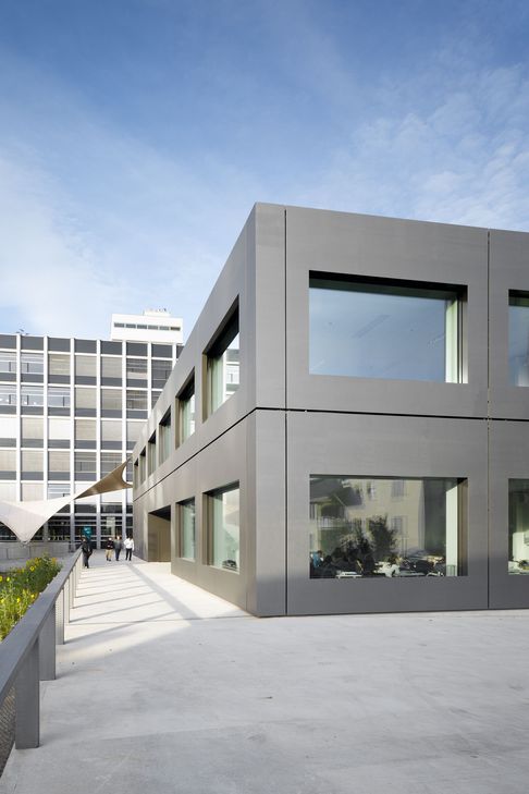 Das Gebäude weist eine Betonskelettstruktur auf und ist mit einer Stahlfassade verkleidet. Das Thema der elementierten Fassade, wie sie das Hauptgebäude aufweist, wurde zeitgemäss weiterentwickelt. Der Neubau erfüllt den Minergie eco-Standard.