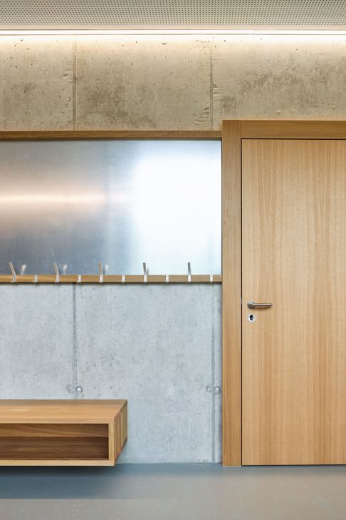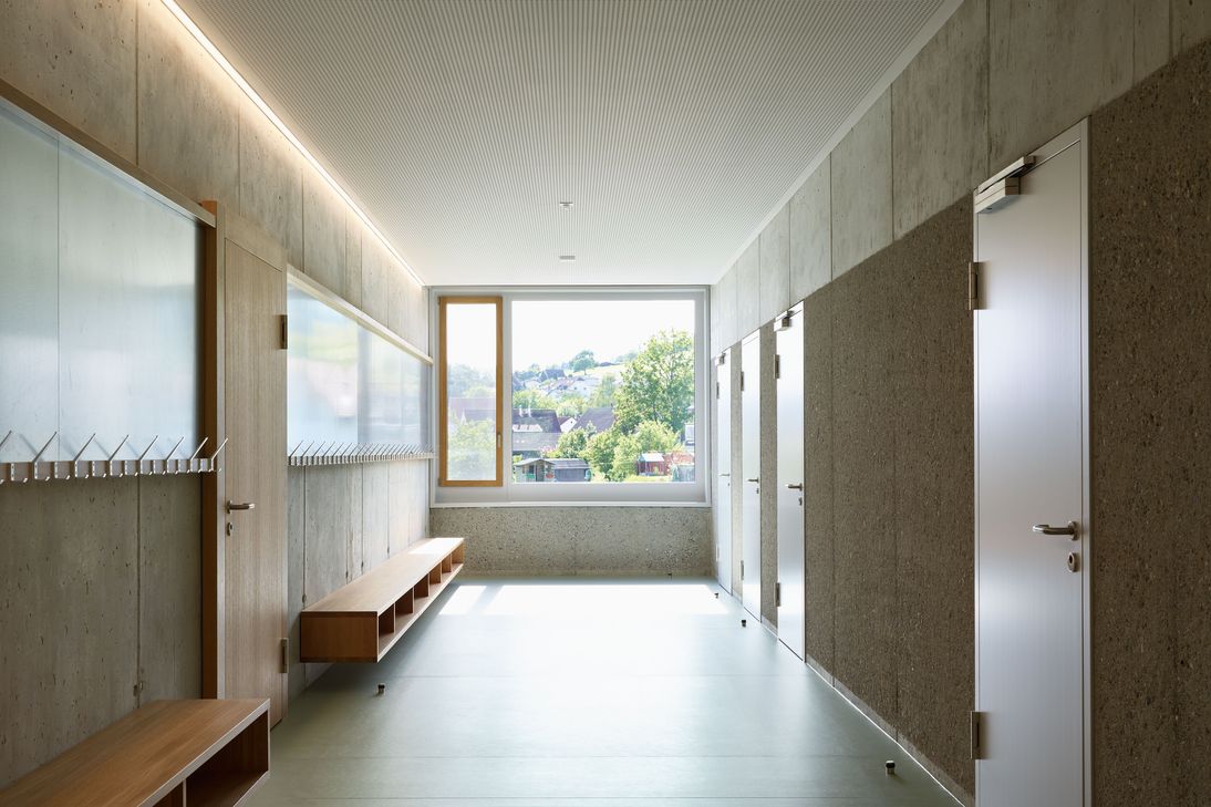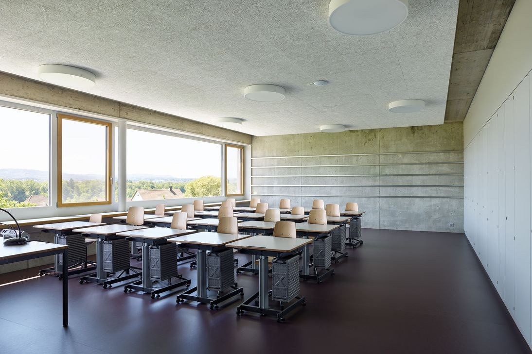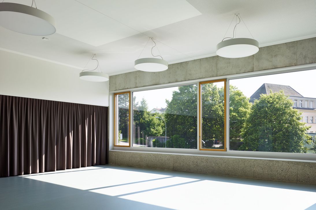 Während dem sich die Unterrichtsräume gegen Süden orientieren, nimmt die Aula mit dem grossen Fenster in der Ostfassade Bezug zur bestehenden Schulanlage. Die Aula ist durch ihre erhöhte Volumetrie ablesbar und bildet den Kopf des Gebäudes.