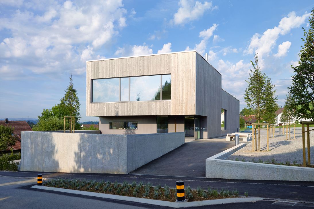 Die verwendeten Materialien sind vorwiegend Beton und Holz – Materialien, welche durch den grossen Waldanteil und das allgegenwärtige Vorkommen von Kies einen engen Bezug zu Auenstein haben. Die vorvergraute Fassade erschliesst sich erst auf den zweiten Blick als Holzfassade. Das mattsilberne Grau, in welchem die Schalung im trockenen Zustand schimmert, könnte auf`s Erste auch als Betonoberfläche gelesen werden. Diese Ambivalenz ist gewollt. Das Fassadenmaterial erscheint zurückhaltend und strahlt trotzdem eine gewisse Lebendigkeit und Wertigkeit aus.