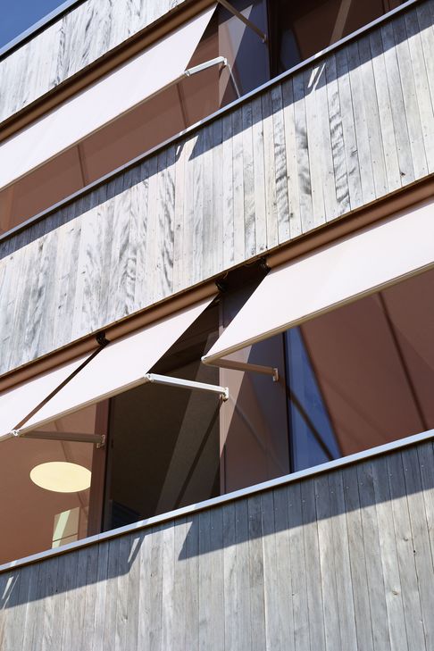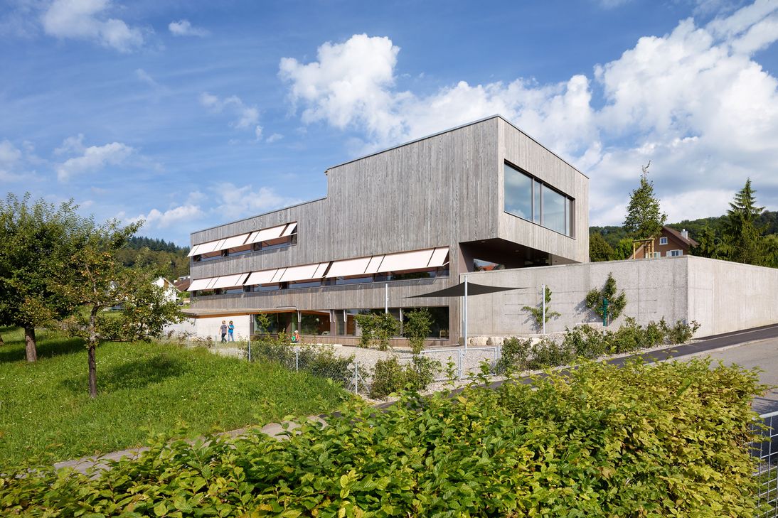 Die Fallarmmarkisen und deren Storenstoff erinnern in Art und Farbe an traditionelle Schulhäuser.
