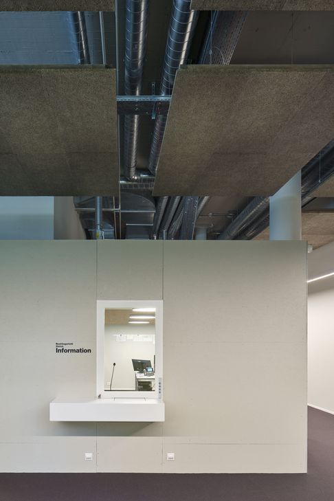 In den überhohen Geschossen EG und 1.OG sind 12 Gerichtssäle mit Besprechungszimmer und Nebenräumen untergebracht. Die Gerichtssäle sind als autonome Boxen (Raum im Raum) konzipiert, dazwischen liegt der Erschliessungsbereich. Die Boxen sind gangseitig mit gestrichenen OSB-Platten verkleidet und betonen den provisorischen Charakter des Innenausbaus. Die Signaletik (Hinder Schlatter Feuz) mit aus der Sprache von Plakatwänden im öffentlichen Raum entlehnten Elementen unterstützt den provisorischen Charakter und führt Besucher durch die Anlage.