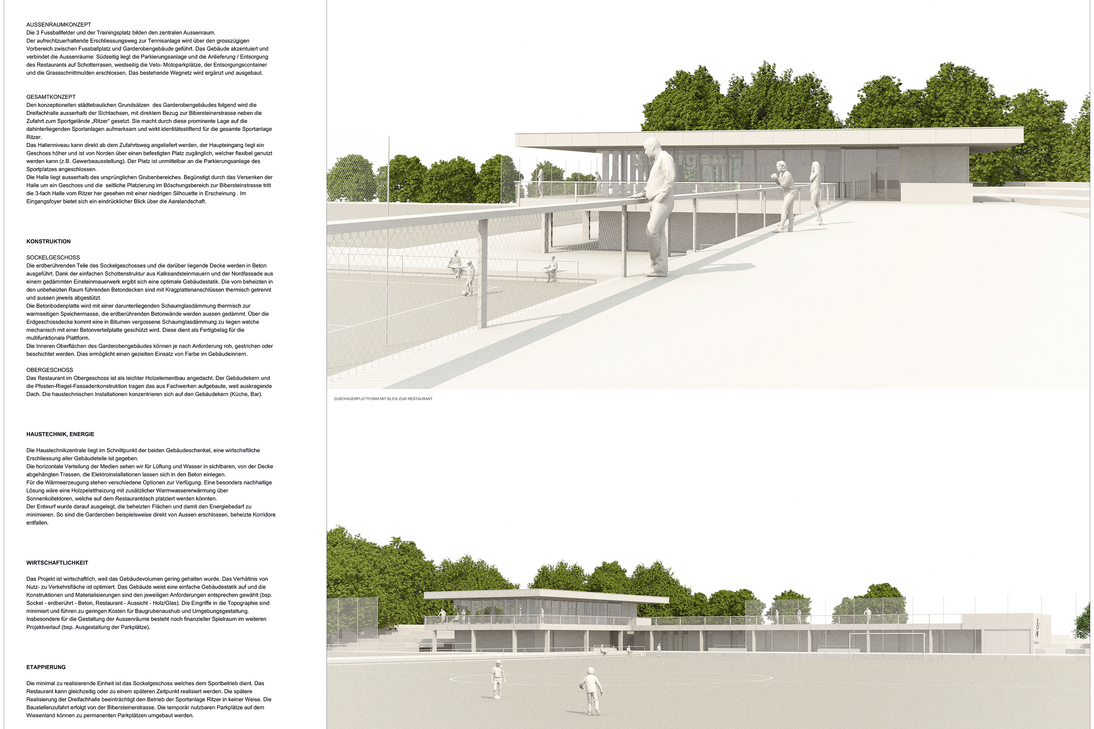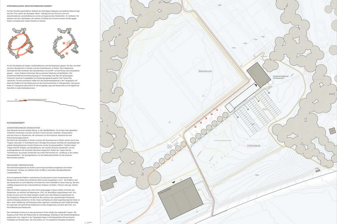 Auf dem künstlich geschaffenen Gelände der ehemaligen Kalkgrube und späteren Deponie liegt seit den 70-er Jahren der Sportplatz „Ritzer“. Geprägt wird der Ort durch zwei sich überschneidende Landschaftsräume und die sie begrenzenden Waldstreifen. Im nördlichen Teil befinden sich die 4 Sportplätze, der südliche Teil öffnet sich mit einer leichten Anhöhe gegen Süden und bietet einen weiten Ausblick ins Aaretal. An der Schnittstelle der beiden Landschaftsräume wird der Baukörper gesetzt. Der Bau vermittelt zwischen Sportbereich im Norden und dem Aussichtsraum im Süden. Das Erdgeschoss beinhaltet die Räumlichkeiten des Sportbetriebes und schafft - auf das Niveau des Hauptplatzes gesetzt - einen direkten funktionalen Bezug zwischen Gebäude und Spielfeldern. Der aufrechtzuerhaltende Erschliessungsweg zur Tennisanlage wird über den grosszügigen Vorbereich zwischen Fussballplatz und Garderobengebäude geführt. Den Verlauf des natürlichen Terrains ausnützend, bettet sich das Garderobengebäude in die Topographie und bildet die Plattform für das Restaurant und den Zuschauerbereich im Obergeschoss. Der grosse Anteil an Transparenz steht betont für die einzigartige Lage des Restaurants und ermöglicht die freie Sicht in beide Geländekammern.
