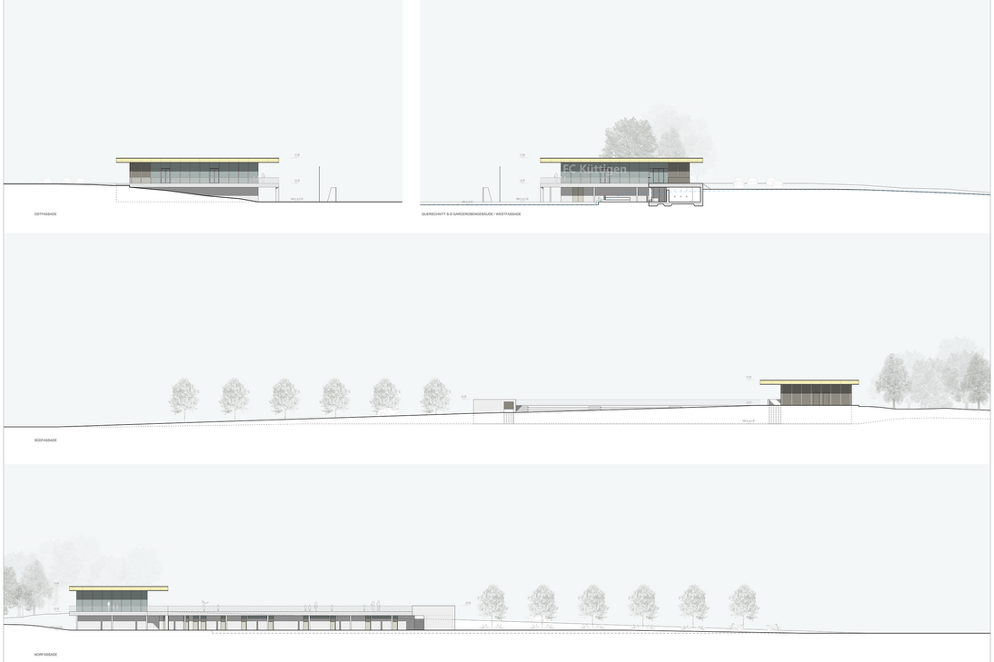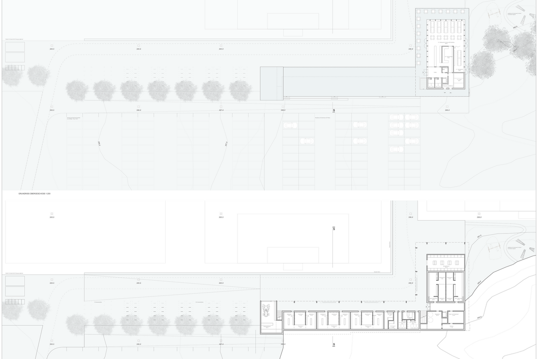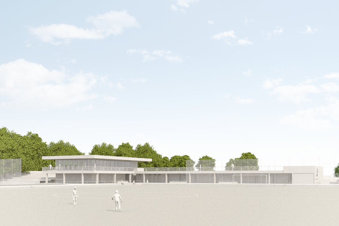 Das Gebäude hat einen direkten Bezug zu den Spielfeldfeldern. Es ist über einen gedeckten Vorbereich erschlossen und kann auf einen inneren Korridor verzichten. Entsprechend wird das Innere zur Sauberzone, der Vorbereich zur Schmutzzone, dezentral sind drei Schuhwaschanlage platziert. Die Ebene der Sportplätze im Norden und jene der Erschliessung im Süden werden durch zwei Treppen verbunden. Im Schnittpunkt des L-förmigen Grundrisses verbindet die Haupttreppe den unteren Sportplatzbereich mit dem Restaurant und der Zuschauerplattform. Westlich dieser Treppe sind WC-Anlagen und Sanitätsräume, die Junioren-Senioren Garderoben und der Aussengeräteraum als räumlicher Abschluss angeordnet. Östlich der Treppe sind die Technikräume, die grossen Garderoben der ersten Mannschaft und - mit Bezug zu den beiden Hauptspielfeldern - der Sportgeräteraum mit den Materialsschränken für die einzelnen Mannschaften platziert.