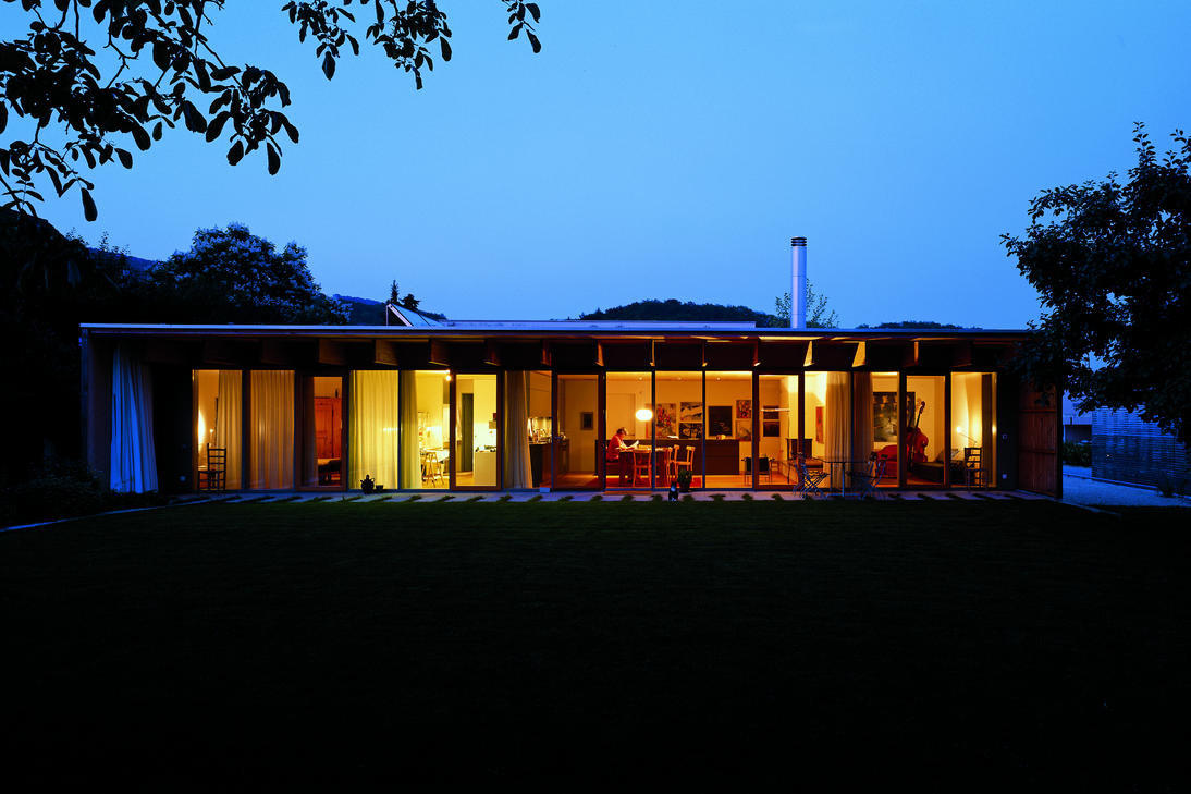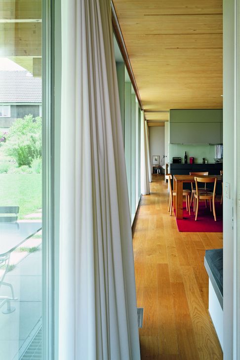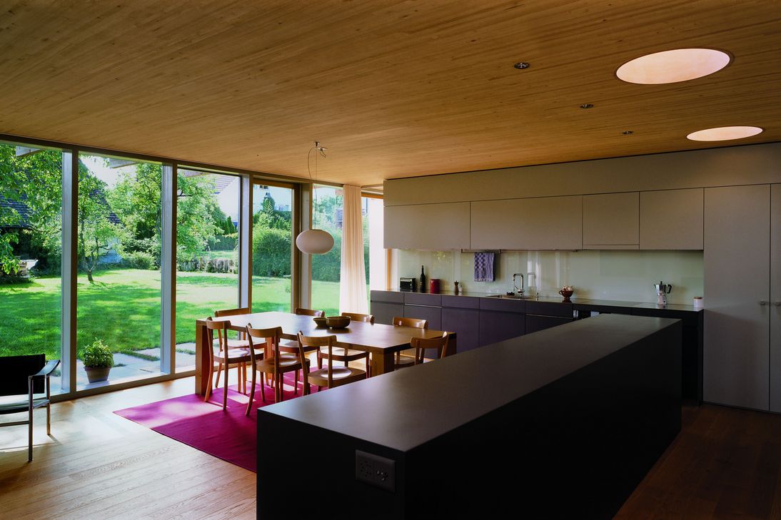Ein ostseitig angebauter Nebenraum von 4 x 9 m übernimmt die Funktionen Haustechnik und Stauraum. Der Bodenbelag im Wohnbereich in geölter Eiche kontrastiert zu den aufgehenden, gestrichenen Bauteilen wie Wände, Fenster und Einbaumöbel. Die Untersichten der vorfabrizierten Deckenelemente in verleimter Fichtenstabtechnik sind naturbelassen. Das Zentrum des Wohnbereichs bildet ein grosser Eichentisch. Er ist dreiseitig umgeben von den Elementen Küche, Seitenmöbel und Cheminée mit Sitzbank.