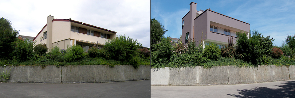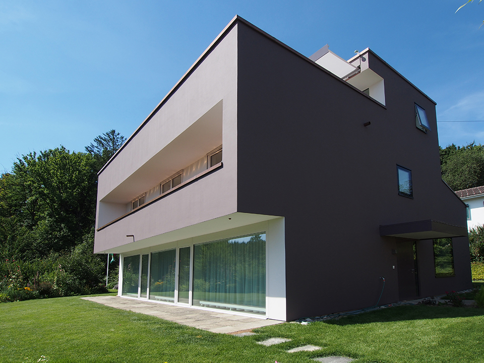 Das ursprüngliche 1960er-Haus liegt leicht erhöht direkt am dichten Buchenwald. In zeittypischer Art waren sowohl die Beton-/ Backstein-Konstruktion, wie auch die Dimension der Räume auf das Wesentliche konzentriert. Dem bestehenden Raumangebot waren ein gedeckter Sitzplatz und ein zusätzliches Zimmer anzufügen. Der Sitzplatz wurde erdgeschossig gegen den Wald angebaut, das Zimmer wurde in Kombination mit einer Dachterrasse als Attikageschoss aufgesetzt. Diese ermöglicht neu den weiten Blick ins Aaretal. Aus Gewichtsgründen wurde der Aufbau als leichte Holzelementkonstruktion ausgeführt. Damit trotz der Mischkonstruktion eine homogene, verputzte Gebäudehülle das lebendige Volumen umschliesst, entschied sich die Bauherrschaft für eine hinterlüftete Verotec – Fassade. Die Lochfenster in der Fassade sind bündig gesetzt und inszenieren mit ihren tiefen Futterleibungen die eindrückliche Aussicht in den Buchenwald. Die raumhohen Verglasungen sind durch Vordächer oder Fassadeneinschnitte geschützt. Sämtliche sanitären Anlagen und die Wärmeverteilung wurden erneuert und die elektrische Installation auf den heutigen Stand gebracht. Es wurde eine neue Komfortlüftung eingebaut. Die schwach armierten Betondecken mussten mit Glasfaserlamellen verstärkt werden. Der Umbau erreicht Minergie-Standard.