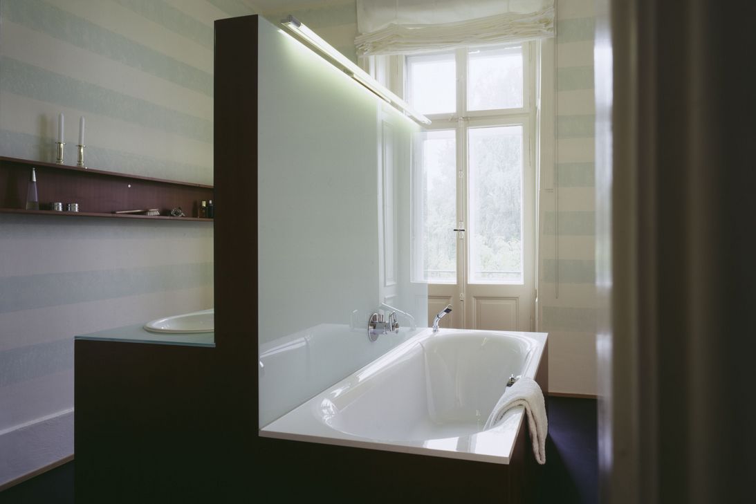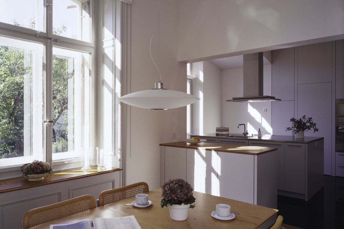 Unsere Interventionen im Innern sind zurückhaltend und sorgfältig in Bezug auf den Bestand. Neue Elemente werden bewusst eingesetzt, ohne in schrille Kontrastarchitektur zu verfallen. Den grössten Eingriff erfuhr der Eingangsbereich: das Entrée mit Garderobe und das Treppenhaus wurden zu einer luftigen und lichtdurchfluteten Einheit umgebaut. Die neuen Sanitärmöbel in Küche und Bad sind als Inseln frei in den Raum gestellt und von allen Seiten zugänglich.